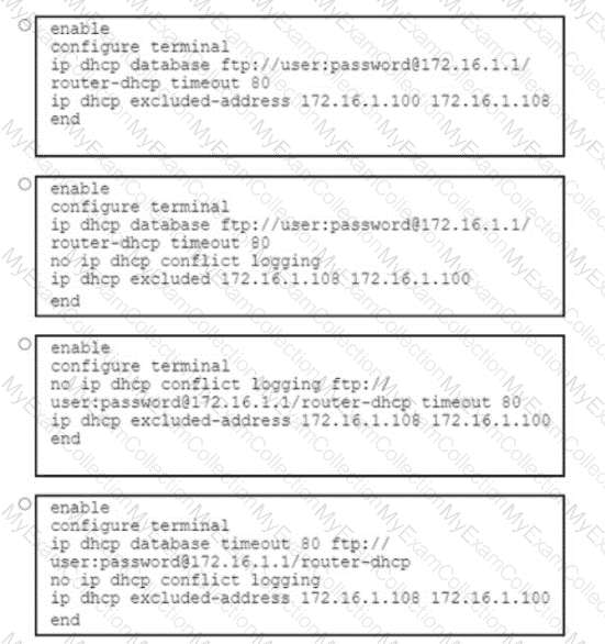 An engineer must configure a DHCP server to save automatic bindings on a remote host that has an IP address of 172.16.1.1. The IP address range of 172.16.1.100 to 172.16.1.108 must be blocked from the DHCP server. Which set of commands must the engineer run?