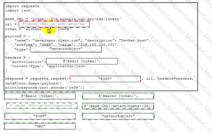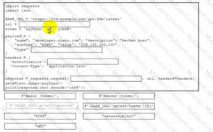 Drag and drop the code from the bottom onto the where the code is missing to create a host object by using the Cisco Firepower Device Manager API. Not all options are used.