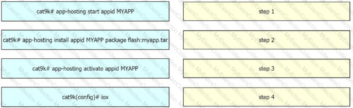 Drag and drop the steps from the left into the order on the right to configure and install a container on a Cisco Catalyst 9000 Series Switch.