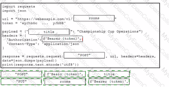 A developer is creating a Python function that adds network engineers to a Webex room to troubleshoot after a monitoring alert Drag and drop the code from the bottom onto the box where the code is missing in the Python function to add the engineers to the room. Not all options are used.