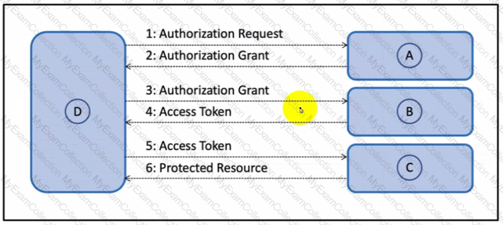 Drag and drop the components from the Oauth2 authorization protocol flow on the left onto the letter that matches the location in the exhibit.