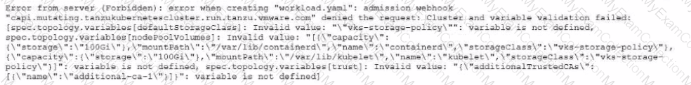 An administrator is upgrading to VKS 3.4 and encounters the following error during cluster creation using workload, yami: