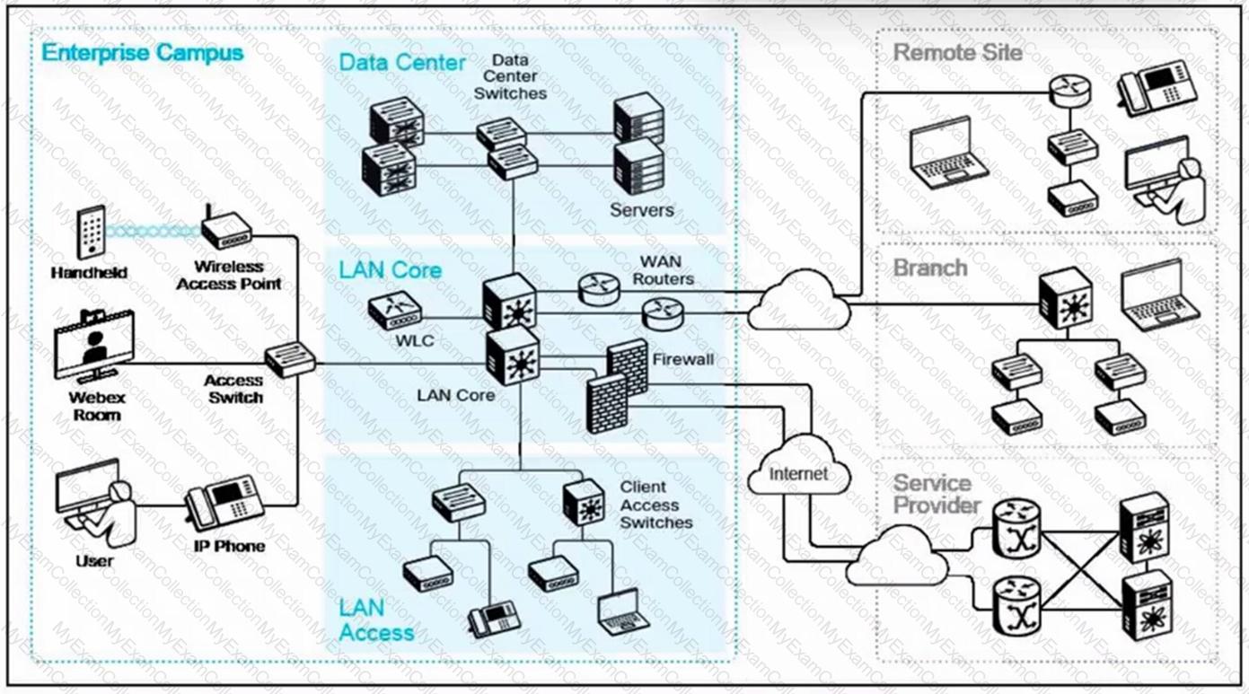 Refer to the exhibit. What are two ways remote sites or branchesconnect to the enterprise campus network? (Choose two.)