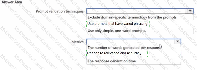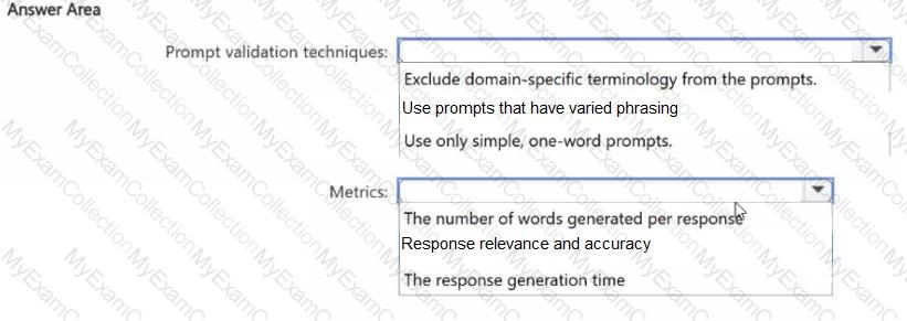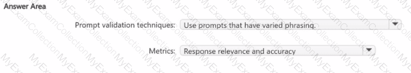 You need to validate prompt engineering best practices to ensure that the agents generate accurate and contextually relevant responses. Which prompt validation techniques and metrics should you include in the solution? To answer, select the appropriate options in the answer area.