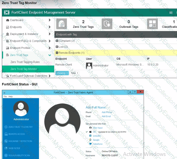 Refer to the exhibits, which show the Zero Trust Tag Monitor and the FortiClient GUI status.