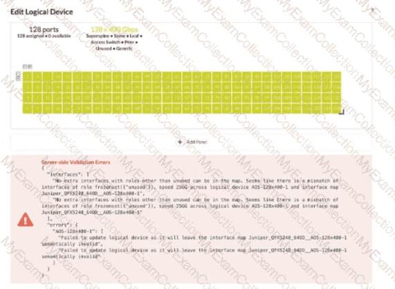 You are using Juniper Apstra to create logical devices and interface maps. You use them in three different rack types. You then modify the logical devices to support the required increased interface speeds and receive an error message when updating the logical devices.