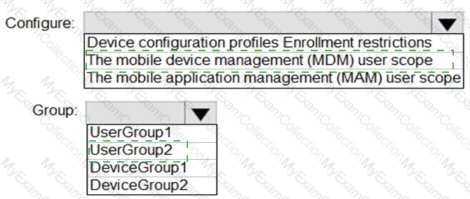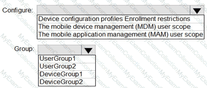 What should you configure, and to which group should you assign the configurations? To answer, select the appropriate options in the answer area.
