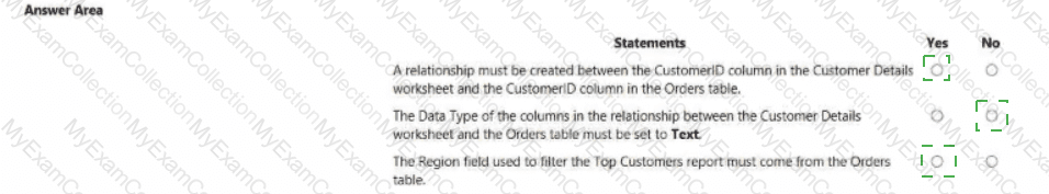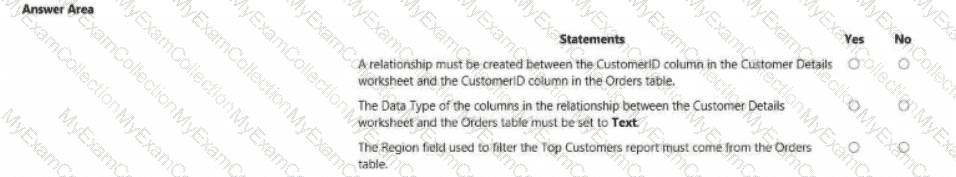 You need to design the data model and the relationships for the Customer Details worksheet and the Orders table by using Power BI. The solution must meet the report requirements.