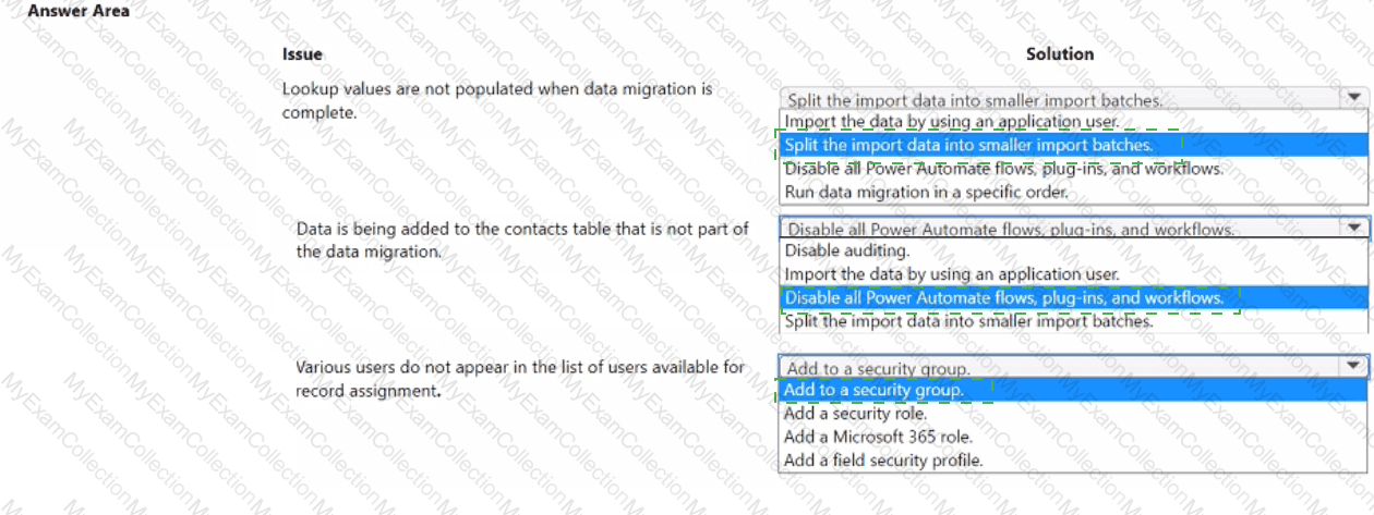You are implementing a Microsoft Power Platform solution for a customer to include data migration from multiple legacy systems. The data includes lead and contact data. The environment includes an assigned security group.