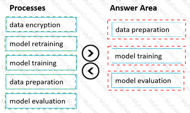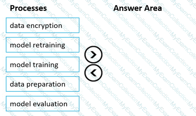 Which three processes should you perform in sequence before you deploy the model? To answer, move the appropriate processes from the list of processes to the answer area and arrange them in the correct order.