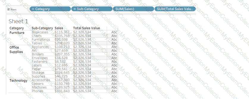 Which method will produce the output for the Total Sales Value field for all the categories shown in the table?