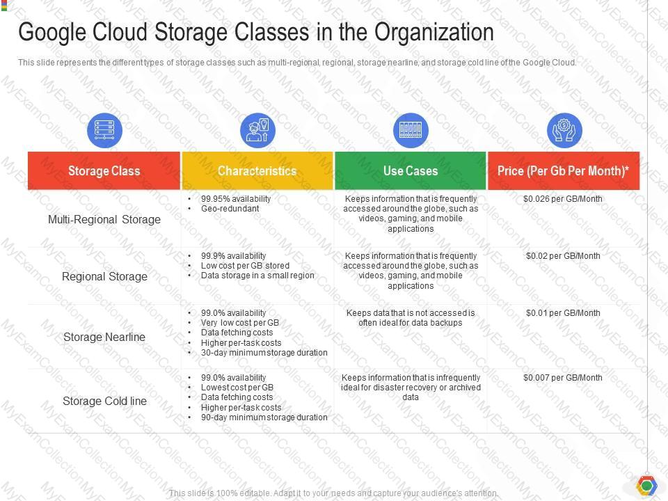 You are building an archival solution for your data warehouse and have selected Cloud Storage to archive your data. Your users need to be able to access this archived data once a quarter for some regulatory requirements. You want to select a cost-efficient option. Which storage option should you use?