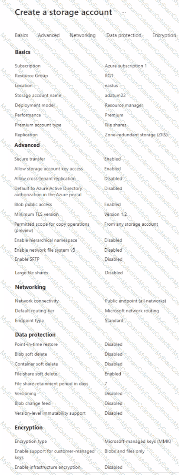 Which type of storage account should you use, and which account should you configure as the destination storage account? To answer, select the appropriate options in the answer area.