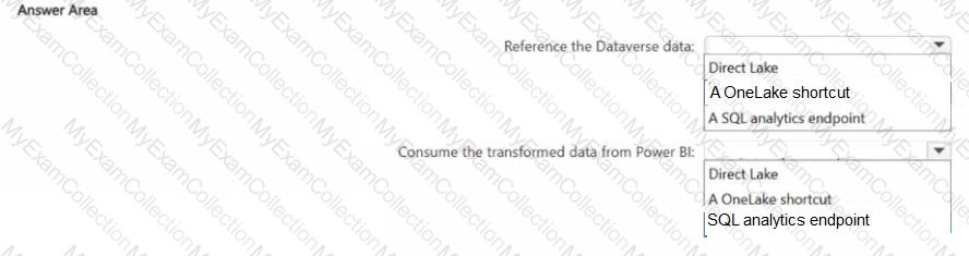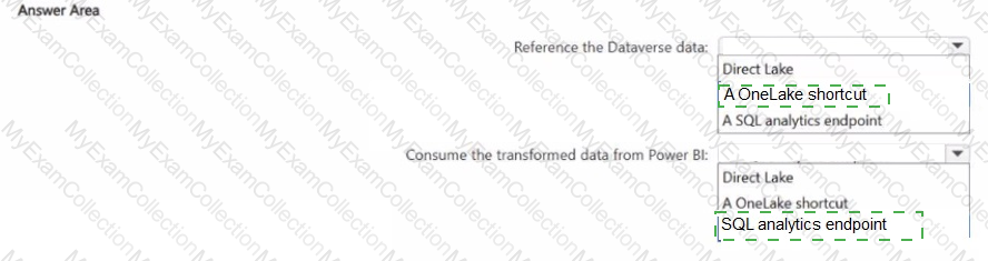 What should you use to reference the Dataverse data and consume the transformed data from Power Bl? To answer, select the appropriate options in the answer area. NOTE; Each correct selection is worth one point.