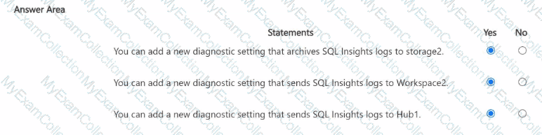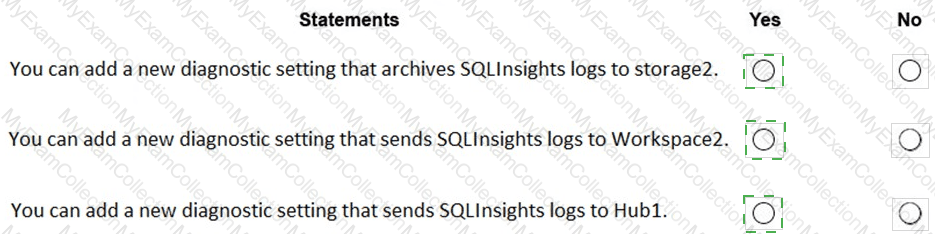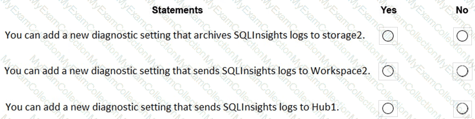 To DB1, you add a diagnostic setting named Settings1. Settings1 archives SQLInsights to storage1 and sends SQLInsights to Workspace1.