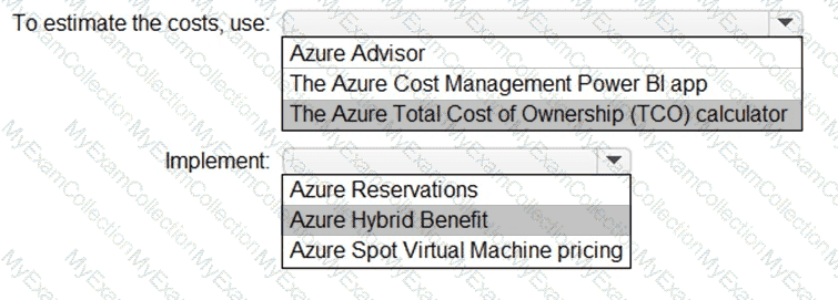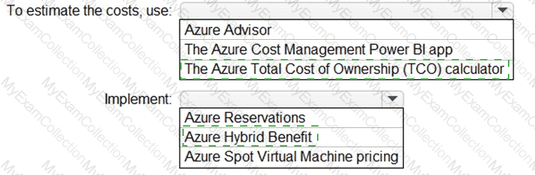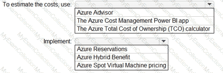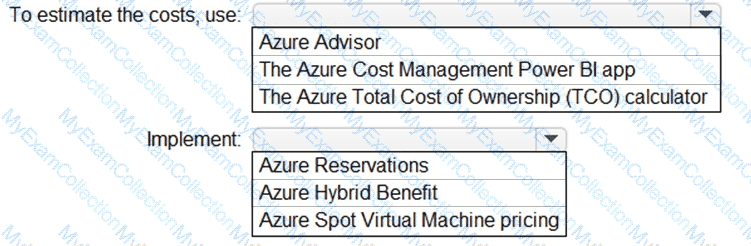 What should you use to estimate the costs, and what should you implement to minimize the costs? To answer, select the appropriate options in the answer area.