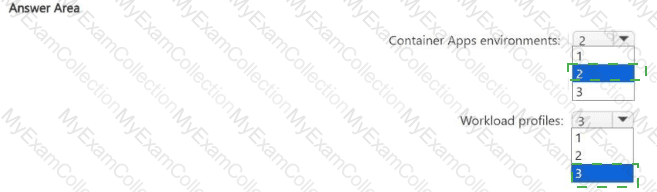 You need to recommend the minimum number of Container Apps environments and workload profiles required. What should you recommend? To answer, select the appropriate options in the answer area.