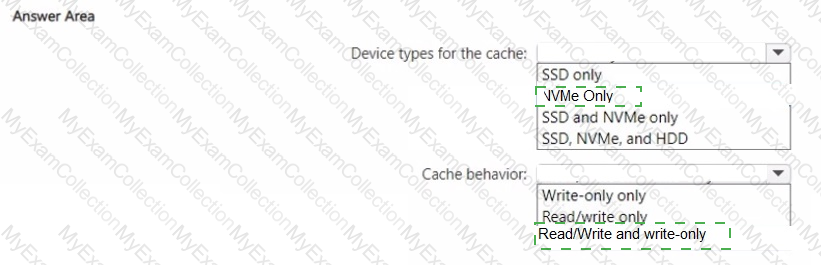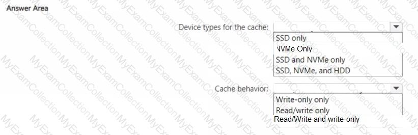 Which types of devices will be used for the cache, and what will be the default cache behavior? To answer, select the appropriate options in the answer area.