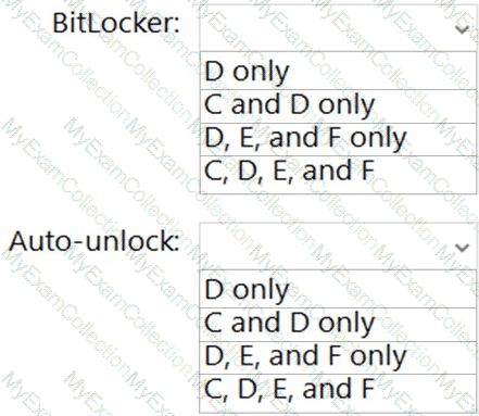 On which volumes can you turn on BitLocker, and on which volumes can you turn on auto-unlock? To answer, select the appropriate options in the answer area.