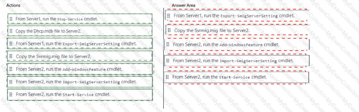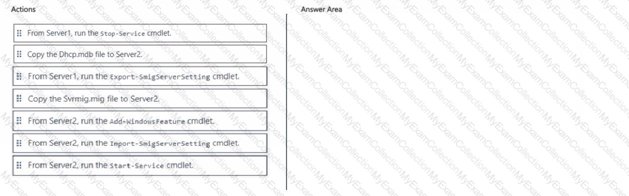 Server1 and Server2 are authorized as DHCP servers in the domain. You need to migrate the DHCP Server role from Server1 to Server2. Which five actions should you perform in sequence? To answer, move the appropriate actions from the list of actions to the answer area and arrange them in the correct order.