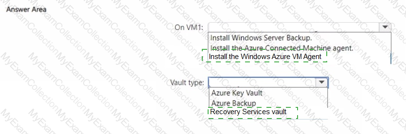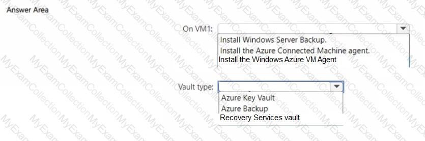 What should you do on VM1, and in which type of vault should you store the backups? To answer, select the appropriate options in the answer area.