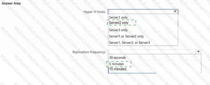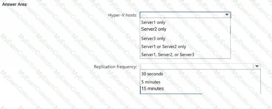 On which Hyper-V hosts can you configure the replication, and what is the minimum replication frequency you can use? To answer, select the appropriate options in the answer area.