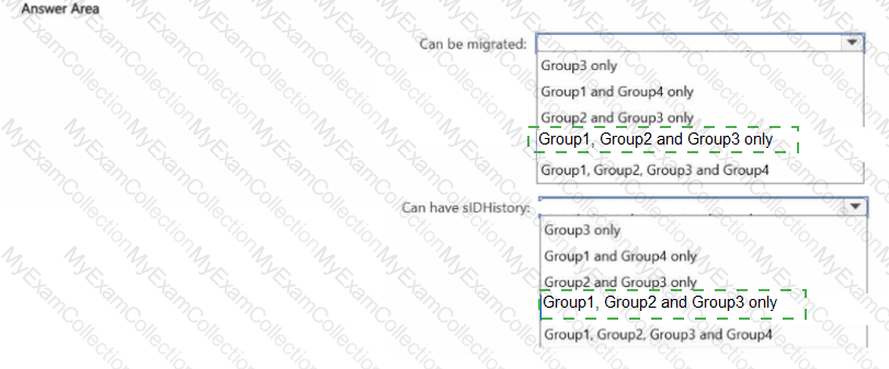 Which groups can be migrated and which groups can have the sIDHistory attribute populated after the migration?