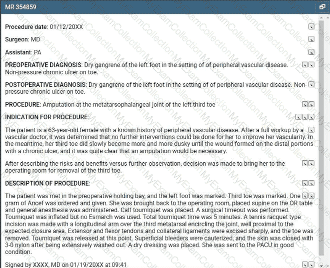 A wedge excision of soft tissue at the lateral margin of an ingrown toenail on the left great toe is performed.