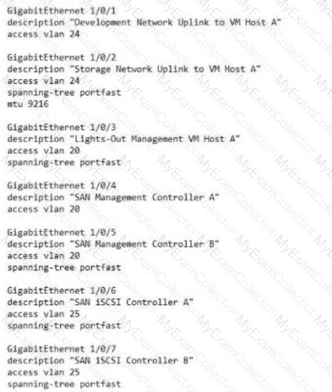 A systems engineer tries to mount an iSCSI LUN to a VM host in a data center, but the host does not discover any iSCSI targets. A sample of the switch configuration is shown in the following image: