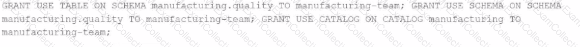 A data engineer needs to provide access to a group named manufacturing-team. The team needs privileges to create tables in the quality schema.