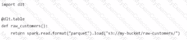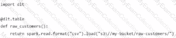 A Data Engineer is building a simple data pipeline using Delta Live Tables (DLT) in Databricksto ingest customer data. The raw customer data is stored in a cloud storage location in JSON format. The task is to create a DLT pipeline that reads the rawJSON data and writes it into a Delta table for further processing.
