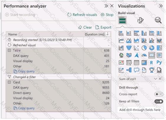 You have a Microsoft Power B1 report and a semantic model that uses Direct Lake mode. From Power Si Desktop, you open Performance analyzer as shown in the following exhibit.