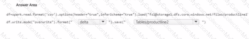 You need to migrate the Research division data for Productline2. The solution must meet the data preparation requirements. How should you complete the code? To answer, select the appropriate options in the answer area