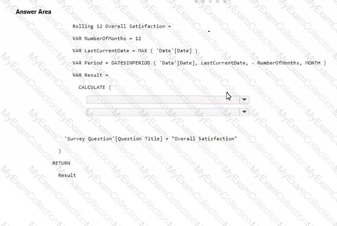 How should you complete the DAX code? To answer, select the appropriate options in the answer area.