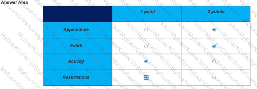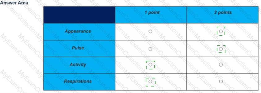 An EMT has just assisted with the delivery of a newborn. At the five-minute mark, the neonate is completely pink with a pulse of 108/min. The neonate has some flexion of their extremities, but the breathing is still slow. How should the EMT score the following categories of the APGAR scale? Select the correct value for each sign.