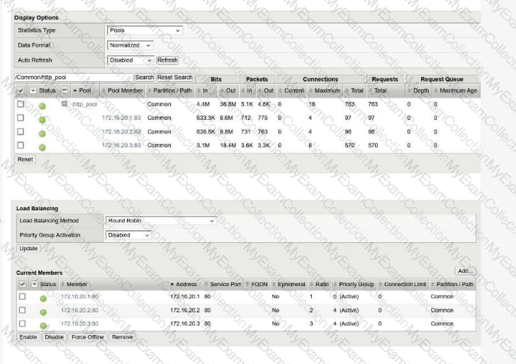 A BIG-IP Administrator configured a virtual server with a pool of 3 members and selected the Round Robin load balancing method to evenly distribute traffic across the pool members. During initial testing, traffic was not evenly distributed and the pool member 172.16.20.3 received more traffic than the other pool members.