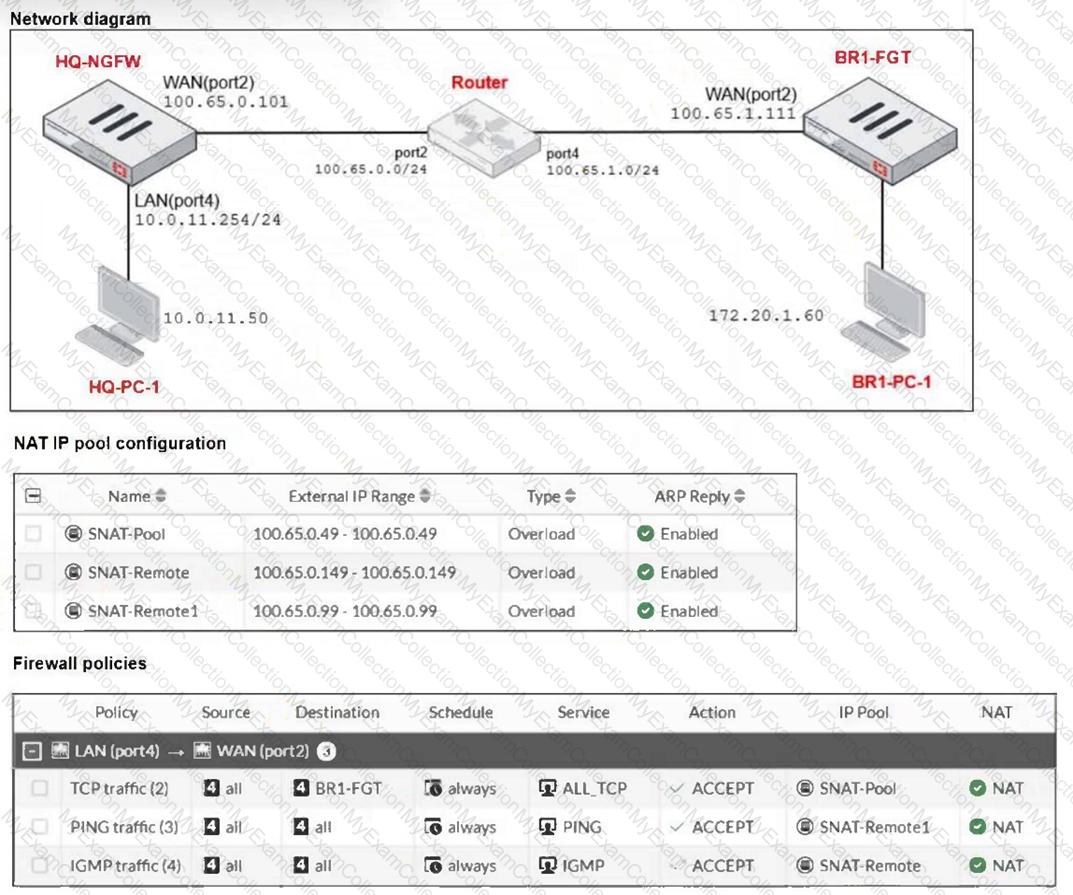 HQ-PC-1 (10.0.11.50) pings the IP address of BR-FGT (100.65.1.111)