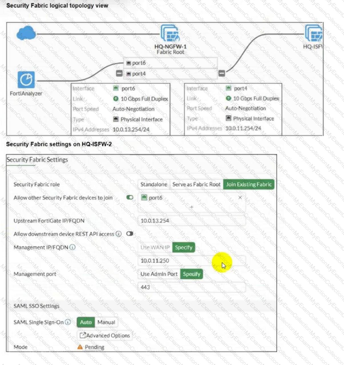 An administrator wants to add HQ-ISFW-2 in the Security Fabric. HQ-ISFW-2 is in the same subnet as HQ-ISFW. After configuring the Security Fabric settings on HQ-ISFW-2, the status stays Pending.