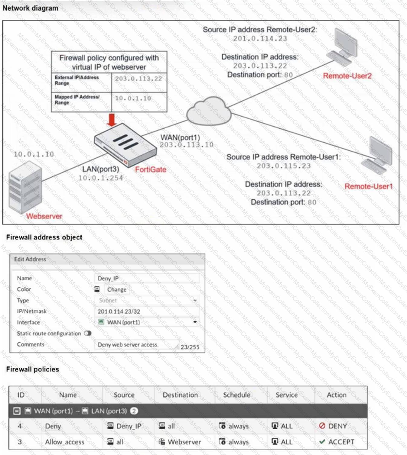The exhibits show a diagram of a FortiGate device connected to the network, and the firewall configuration.