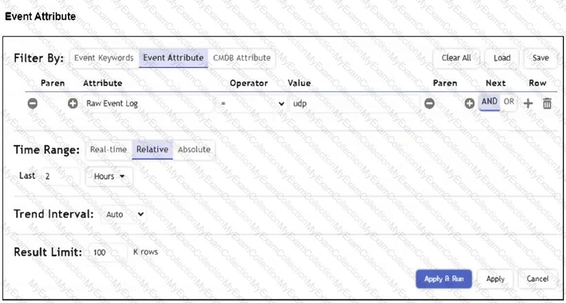 A FortiSIEM device is receiving syslog events from a FortiGate firewall. The FortiSIEM analyst is trying to search the raw event logs for the last two hours that contain the keyword "udp". However, they are getting no results from the search, which they know should be available. Based on the filter shown in the exhibit, why are there no search results?