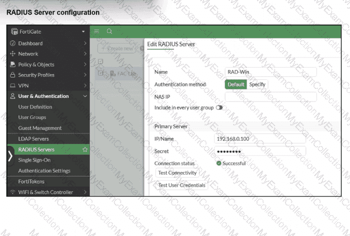 On FortiGate, a RADIUS server is configured to forward authentication requests to FortiAuthenticator, which acts as a RADIUS proxy. FortiAuthenticator then relays these authentication requests to a remote Windows AD server using LDAP.
