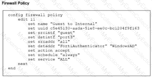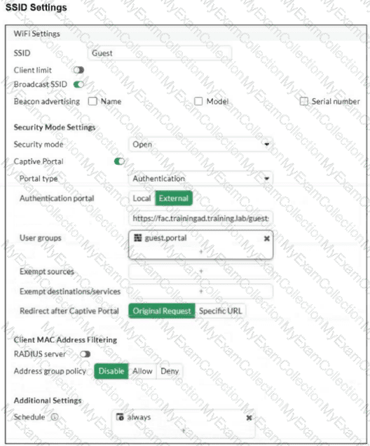Examine the firewall policy configuration and SSID settings. Users trying to connect to the new Guest wireless network should be redirected to an external captive portal, however, these wireless users are not able to see the captive portal login page. The external captive portal URL has been verified as correct, yet the issue persists. Which configuration change should fix the problem?