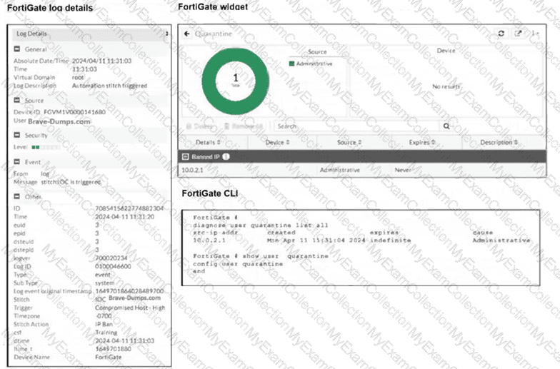 The exhibits show the FortiGate logs, widget, and CLI. Security Fabric quarantine automation is being tested using a device with the IP address 10.0.2.1, which is connected to a managed FortiSwitch. Shortly after attempting to access a malicious website, the device loses access to the internet and other VLANs within the network. However, it can still communicate with other devices within the same VLAN. Which configuration change is required to fix the issue?