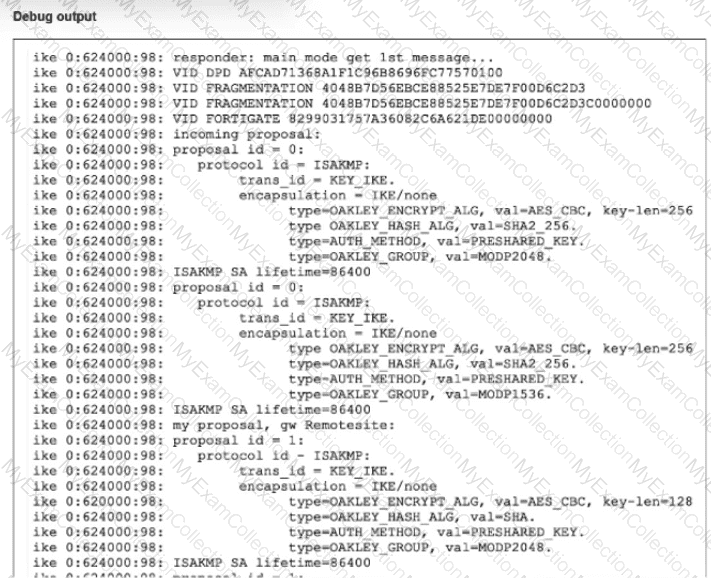 The debug command for IKE was enabled and, in the exhibit, you can review the partial output of the debug IKE while attempting to bring the tunnel up.