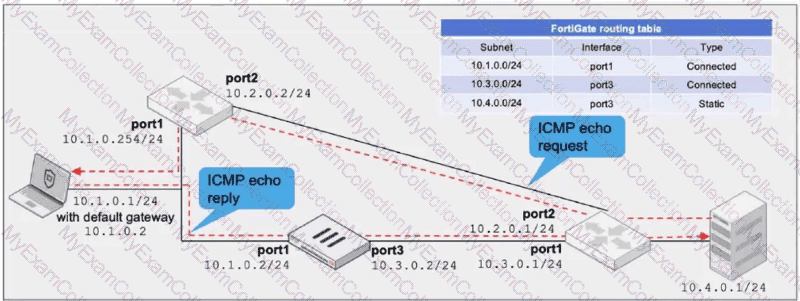 FortiGate has already been configured with a firewall policy that allows all ICMP traffic to flow from port1 to port3.