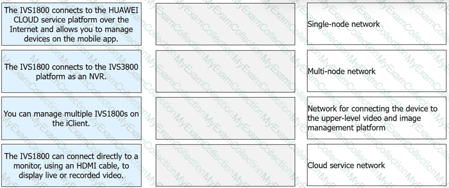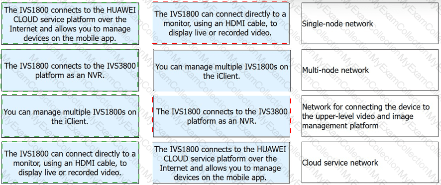 The matching is based on the deployment role of each IVS1800 network type. The cloud service network is the mode used when the IVS1800 connects outward through the Internet to Huawei cloud services for remote device management, so it matches the feature about connection to the HUAWEI CLOUD service platform and mobile-app management. The network for connecting the device to the upper-level video and image management platform is the upstream integration path used when the IVS1800 works under a larger platform such as the IVS3800 , so that feature matches the statement about connecting to the IVS3800 platform as an NVR .