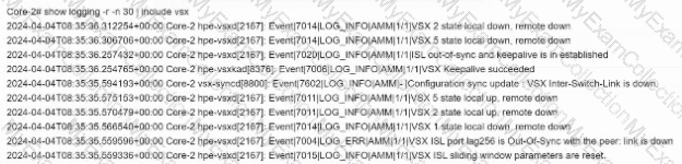 Your network monitoring system has issued a critical alert indicating that the ISL between two VSX core switches is down. What can you determine from the log output below?
