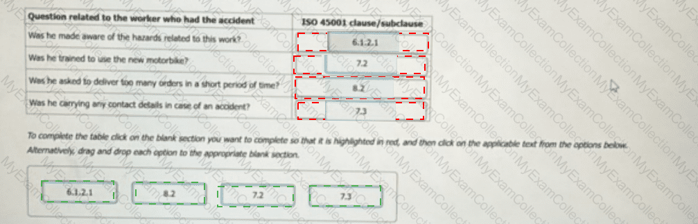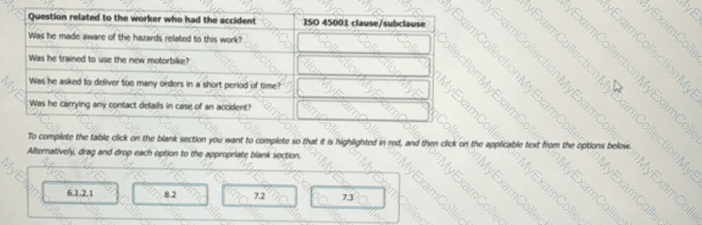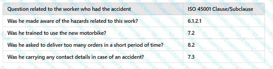A well-known fast-food organisation (ISO 45001 certified) contracts young people to deliver orders; last week one of them died in a street accident riding for the first time a new motorbike provided by the organisation. You will lead the recertification audit in two weeks, and you plan to prepare a checklist to investigate this incident. The following are potential questions you might ask; match them to the related ISO 45001 clause/subclause.Â