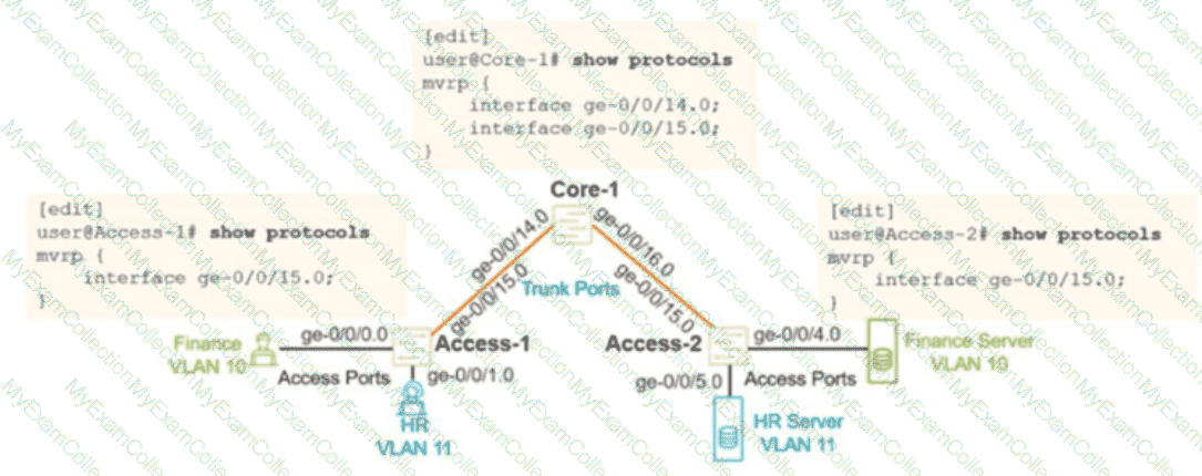 You configured MVRP in your Layer 2 network using the configuration shown in the exhibit. You verified that the appropnate VLANs are configured and applied on the two access switches. You are using RSTP as your loop prevention mechanism. Unfortunately, the users are not able to communicate with their corresponding server attached to the Access-2 switch.