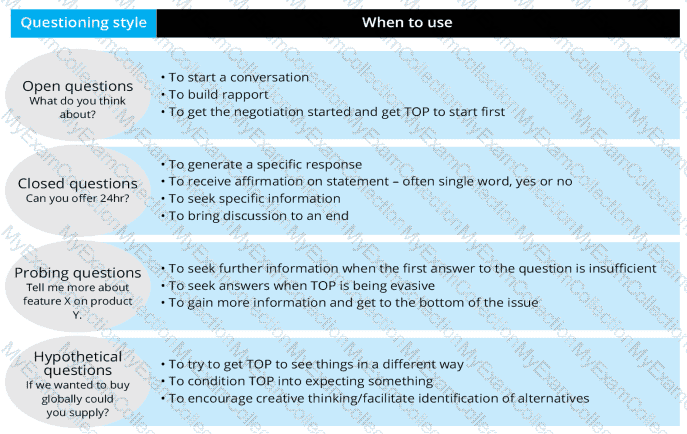 A negotiation meeting commences with the supplier asking the buyer 'How do you feel about the service you receive from us currently?', followed by 'What do you think about our latest products?' and 'How do we compare with other suppliers you use?'